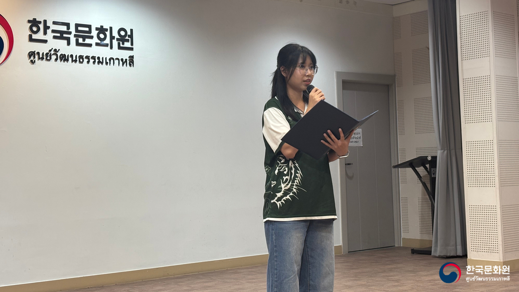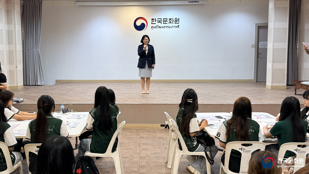 นางซอนจู ลี ผู้อำนวยการศูนย์วัฒนธรรมเกาหลี ได้กล่าวต้อนรับอย่างอบอุ่น และหวังว่าประสบการณ์ในวันนี้จะเป็นประโยชน์ในการเรียนภาษาเกาหลี และช่วยให้นิสิตทุกท่านได้ใกล้ชิดกับประเทศเกาหลีมากยิ่งขึ้น พร้อมทั้งอวยพรให้นิสิตทุกท่านเติบโตเป็นกำลังสำคัญในการพัฒนาความสัมพันธ์ของประเทศเกาหลีและประเทศไทยในอนาคต