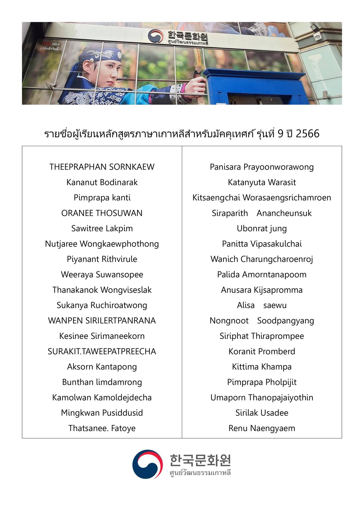 ประกาศรายชื่อผู้เรียน คอร์สภาษาเกาหลีสำหรับมัคคุเทศก์ รุ่นที่ 9