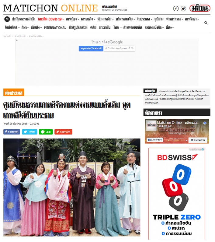 ศูนย์วัฒนธรรมเกาหลีจัดงานแต่งงานเกาหลีแบบดั้งเดิมครั้งแรกในประเทศไทยเพื่อเผยแพร่วัฒนธรรมอันงดงามด้านประเพณีแต่งงานและชุดตามประเพณี เมื่อวันที่ 25 มีนาคม 2565 ณ โคเรียนทาวน์
